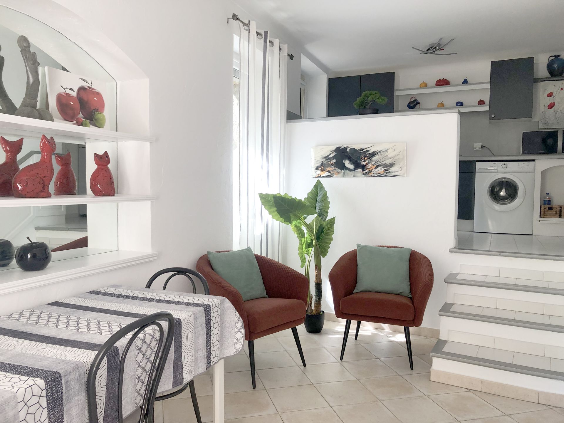 Une cuisine ouverte entièrement équipée, un salon, avec canapé convertible